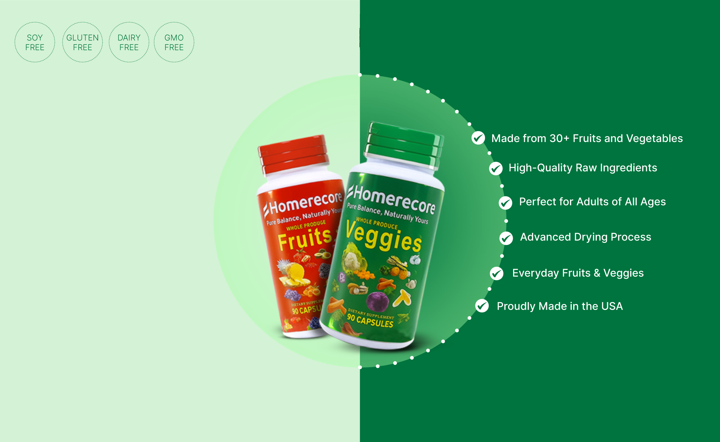 Homerecore’s fruit veggie capsules contain a powerful blend of natural supplements sourced from over 30 whole food ingredients. These dietary supplements help support your energy supplement needs and boost immunity for men and women.